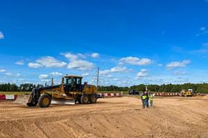 Устройство цементобетонного покрытия осуществляется с применением бетоноукладочного комплекса Wirtgen, состоящего из двух бетоноукладчиков со скользящими формами SP 850 Wirtgen, один из которых оборудован перегружателем бетона, и машины TCM 1800 Wirtgen (финишером), выполняющей отделку поверхности бетонного покрытия.